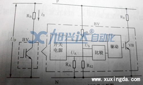 由于功率管VB的驅動電路是低壓電路,只能通過電阻Rs1和Rs2進行分壓,按比例取出Ud的一部分,作為采樣電壓,和穩(wěn)定不變的基準電壓Ua進行比較,得到控制VB導通或截止的指令信號;鶞孰妷篣a的大小應與直流電壓的上限值Udh成比例。