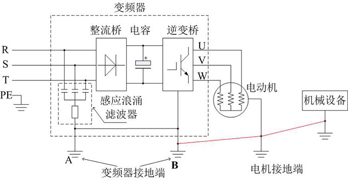為了避免變頻器電機(jī)漏電維修這個(gè)問題,變頻器硬件設(shè)計(jì)中加入了電感浪涌濾波電路(其等效電路如圖1所示),并將電感浪涌濾波的地側(cè)連接到變頻器的外殼上,同時(shí)將變頻器的接線 說明書要求將電機(jī)的地線端子與變頻器的地線端子B連接,將輸入電源的地線(即大地)與變頻器的地線端子A連接。