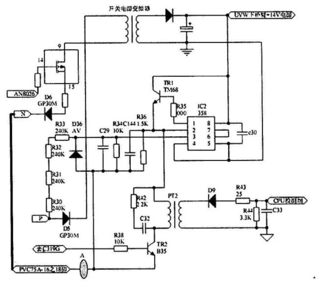 從圖中可以看出,LM358的3腳電壓是經(jīng)過R30、R31、R32、R33降壓后再與R34分壓。其電壓是直流母線電壓的10/(2404+10)倍,也就是約為5v左右的電壓。此電壓輸入LM358的3腳與2腳電位比較,當2腳為低電壓時l腳輸出高電壓,TR1導通,14V電壓經(jīng)過TR1加到變頻器PT2的初極繞組,同時此電壓加到LM358的2腳,高于3腳的5v電壓使之內(nèi)部比較器觸發(fā)翻轉(zhuǎn)1腳輸出低平,TR1關(guān)斷。當2腳電壓降低到5v以下時,比較器再次翻轉(zhuǎn)使TR1導通,如此周而復始。因3腳電壓正比于直流母線電壓的1100左右,TR1的導通與關(guān)斷由LM358的工作狀態(tài)控制,而LM358的狀態(tài)取決于3腳電平的高低。3腳電壓越高則TR1導通與關(guān)斷時間越短。TR2則由UPC319G控制,使PT2初極繞組下端對地導通完成一個完整的充放電電流回路。PT2次極感應電壓經(jīng)過D9、R43、C33等整流成負電壓送給CPU作為直流母線電壓的取樣電壓。uvw下橋臂電源的+14V電源除作為LM358的電源外同時供給UPC319G的電源(圖中沒有畫出)。整流PVC75A-16的內(nèi)部整流后直流母線端N通過18腳相接并送到電源/驅(qū)動板上(如圖中粗線所示),與uvw下橋臂電源的+14V電源負端相連共地而使LM358及UPC319G正常工作。