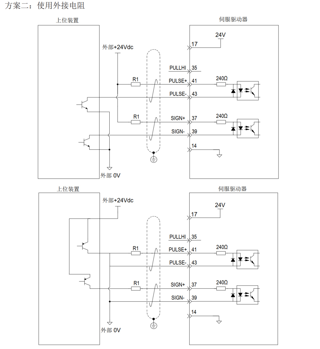 也可采用外接電阻的接線方案,當(dāng)脈沖和方向信號為5V時,不需要接電阻,當(dāng)脈沖和方向信號為24V,R1和R2必須接2KΩ左右的電阻,否則會造成驅(qū)動器損壞。