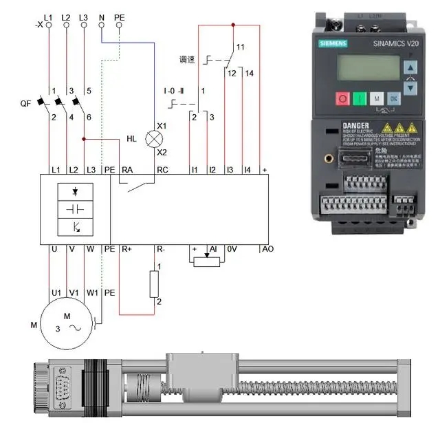 變頻器主回路接線:L1、L2、L3分別為電源進電,變頻器輸出端子分別接到電動機上。