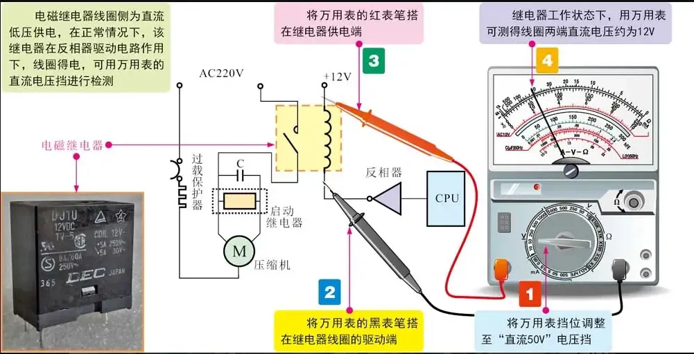 使用萬用表電壓擋檢測電磁繼電器,需要滿足一定的供電條件和環(huán)境。實際檢測時,需要特別注意人身安全,操作人員應避免身體任何部位與帶有220V電壓的器件或觸點碰觸,否則可能會引起觸電危險。