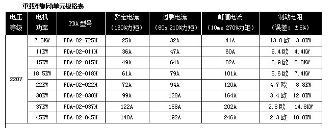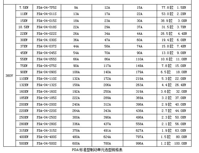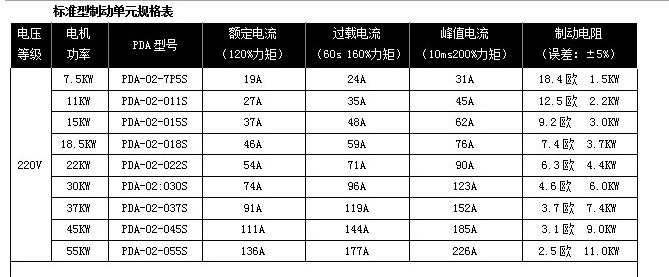 制動電阻是指PDA系列制動單元所允許配接制動電阻值,實據使用的制動電阻必須根據制動單元所配設備的容量和所需制動力矩進行選取。最好選擇IPC標準電阻,保證100%能使用