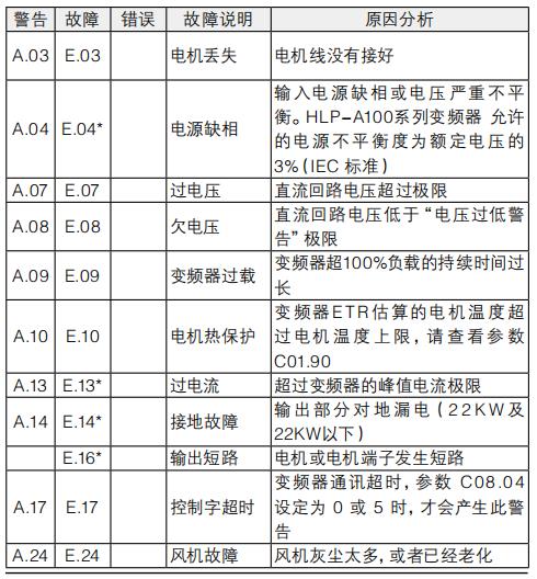 警告說明變頻器由于某種原因工作狀態(tài)已經(jīng)接近設計極限,但仍然可以繼續(xù)工作。如果產(chǎn)生原因不復存在,警告將消失;如果產(chǎn)生原因持續(xù)存在甚至更加嚴重,則變頻器將報故障。警告產(chǎn)生時,面板顯示“A.XX”(XX指數(shù)字)。