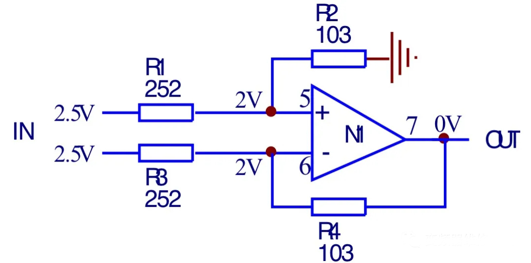 2、進(jìn)一步分析,此時(shí)由于同相輸入端的分壓電路異常,導(dǎo)致原差分放大器的“輸出虛地”條件被破壞,如圖5所示。故使輸出電壓由0V上升為2.5V。