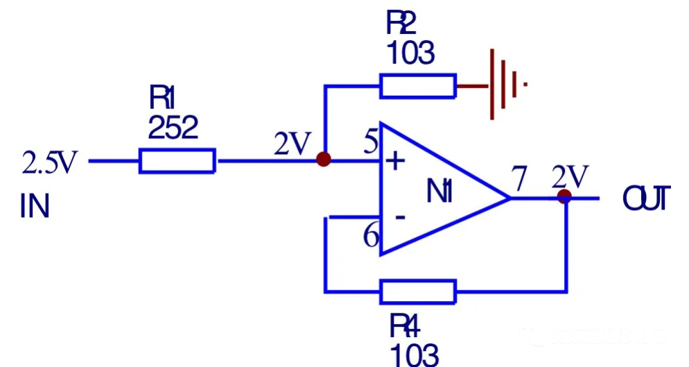 2、進(jìn)一步分析,此時(shí)差分放大器已變身為電壓跟隨器,如圖2所示。