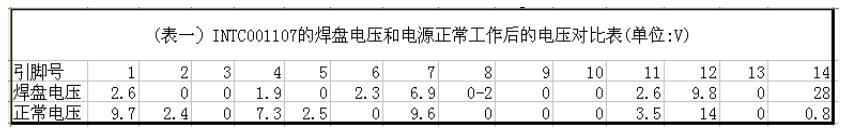 第六步:繼續(xù)整理資料:電源正常后測(cè)得 INTC001107 各腳電壓如表 1 所示。因整塊電路板上覆蓋有保護(hù)膠膜,為了不再使它受到更大的破壞,電路圖就不再繪出了。相信以手頭既有的文字資料也能滿足日常維修工作的需要。