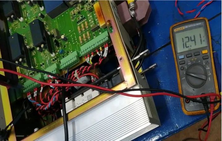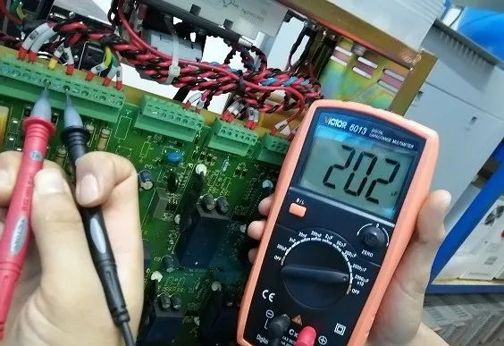2. 濾波電容器  一般功率單元內(nèi)使用6個(gè)濾波電容,采用3串2并的方式使用。給水泵功率單元較大,使用12個(gè)濾波電容,3串4并。串聯(lián)電容總?cè)萘康扔诿總(gè)電容器容量的倒數(shù)和的倒數(shù),并聯(lián)電容總?cè)萘康扔诟鱾(gè)電容器容量的和。測(cè)量時(shí)使用數(shù)字電容表的2000μF×10檔位,測(cè)量總電容值,然后和計(jì)算出來(lái)的總?cè)萘窟M(jìn)行對(duì)比。需要注意的是使用電容表測(cè)量電容器前,應(yīng)對(duì)電容器進(jìn)行放電,另外要注意電容器的正負(fù)極,紅表筆接正極,黑表筆接負(fù)極。