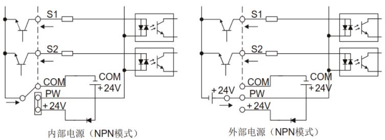 變頻器S(DI)端子的公共端PW和內(nèi)部電源的正極+24V短接,通過(guò)虛線(xiàn)左側(cè)的外部電路使S端子與內(nèi)部電源的負(fù)極COM端子接通,電流即可形成回路,S1端子輸入為真。