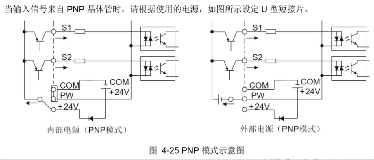 變頻器S(DI)端子的公共端PW和內(nèi)部電源的負(fù)極COM短接,通過(guò)虛線(xiàn)左側(cè)的外部電路使內(nèi)部電源的正極與S端子接通,電流即可形成回路,S1端子輸入為真。
