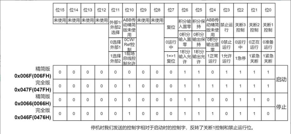 通訊控制字必須存儲(chǔ)在一個(gè)Modbus寄存器中,而每個(gè)寄存器都有一個(gè)地址。按位配置好我們所需的功能,將控制字的二進(jìn)制數(shù)值換算為16進(jìn)制,寫(xiě)入變頻器的控制字寄存器地址即可控制變頻器的啟停。