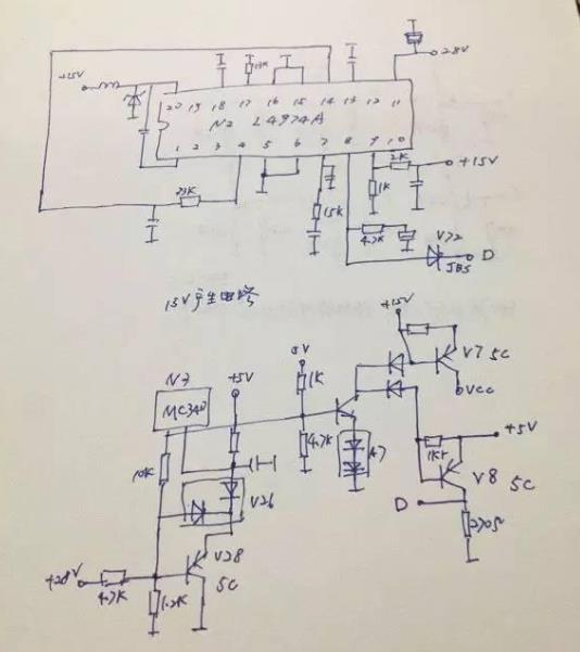 L4974第11腳工作組電壓由開關(guān)電源提供,測試其11腳電壓正常,20腳輸出為0V,其他各腳均不正常,由于沒有時(shí)間分析L4974的工作原理,所以就查其外圍元件,發(fā)現(xiàn)V8已經(jīng)擊穿,更換后工作正常。