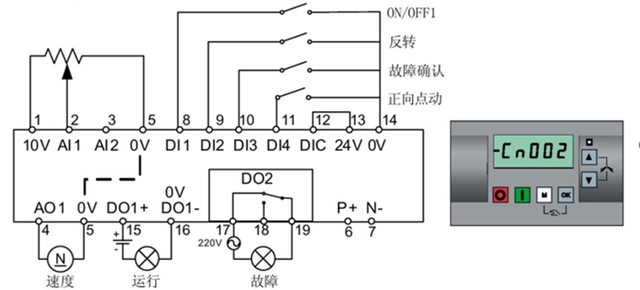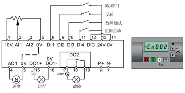 3. 通常端子控制,需要外接指示燈來確認變頻器狀態(tài),當DO2輸出故障時,解除故障可通過DI3端子復(fù)位(故障未消除情況下無效)。
