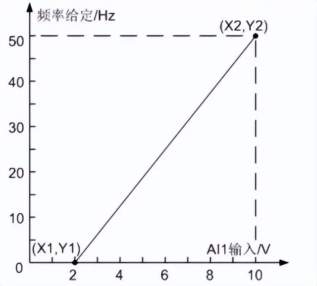 P0760[0]=100.00,直線上第二個點的縱坐標Y2為100%,對應(yīng)50Hz