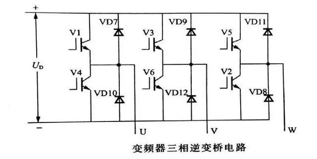 逆變橋電路的功能是把直流電轉(zhuǎn)換成三相交流電。逆變橋電路由下圖中的開關(guān)器件 V1~V6 構(gòu)成。目前中、小容量的變頻器中,開關(guān)器件大部分使用IGBT 管。