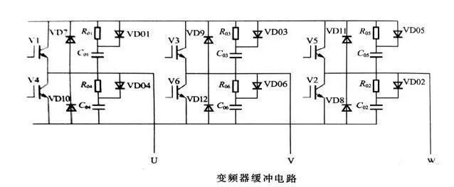 逆變管在關(guān)斷和導(dǎo)通的瞬間,其電壓和電流的變化率是很大的,有可能使逆變管受到損害。因此,每個逆變管旁還應(yīng)接入緩沖電路,以減緩電壓和電流的變化率。緩沖電路的結(jié)構(gòu)因逆變管的特性和容量等的不同而有較大差異,下圖所示的是比較典型的一種緩沖電路(由R01~R06、C01~C06、VD01~VD06構(gòu)成)。