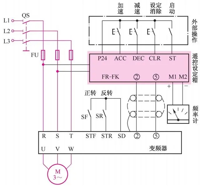 圖4-1 具有遙控設(shè)定箱的變頻器調(diào)速線路