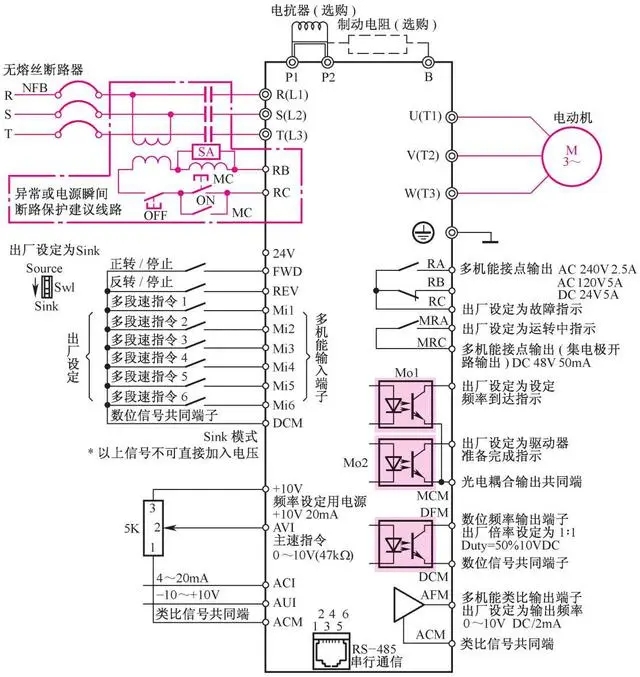 目前變頻器作為新穎的電氣設(shè)備, 在實(shí)際工作中得到了廣泛應(yīng)用, VFD-007V23A變頻器接線線路就是實(shí)際應(yīng)用線路之一, 如圖4-3所示。