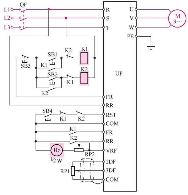 欲使M反轉(zhuǎn), 在IRF-COM接通后, 變頻器UF開(kāi)始運(yùn)行, 其輸出頻率按預(yù)置的升速時(shí)間上升至給定的相對(duì)應(yīng)數(shù)值。 當(dāng)按下停止按鈕SB3后, K1失電釋放, IRF-COM斷開(kāi), 變頻器UF輸出頻率按預(yù)置頻率下降至0, M停轉(zhuǎn)。 按下反轉(zhuǎn)按鈕SB2, 則反轉(zhuǎn)繼電器K2得電吸合, 使接觸器KM2吸合, 電動(dòng)機(jī)反轉(zhuǎn)運(yùn)行。