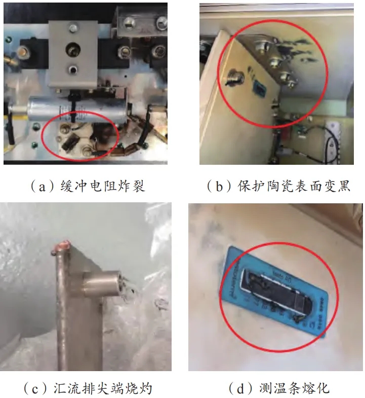 2)檢查濾波模塊發(fā)現(xiàn)直流匯流排保護陶瓷表面出現(xiàn)黑色痕跡,見圖2b;