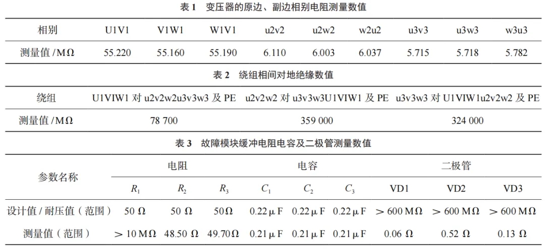 繞組相間對地絕緣數(shù)值見表 2,經(jīng)分析均未發(fā)現(xiàn)異常,由此排除電源輸入模塊故障。
