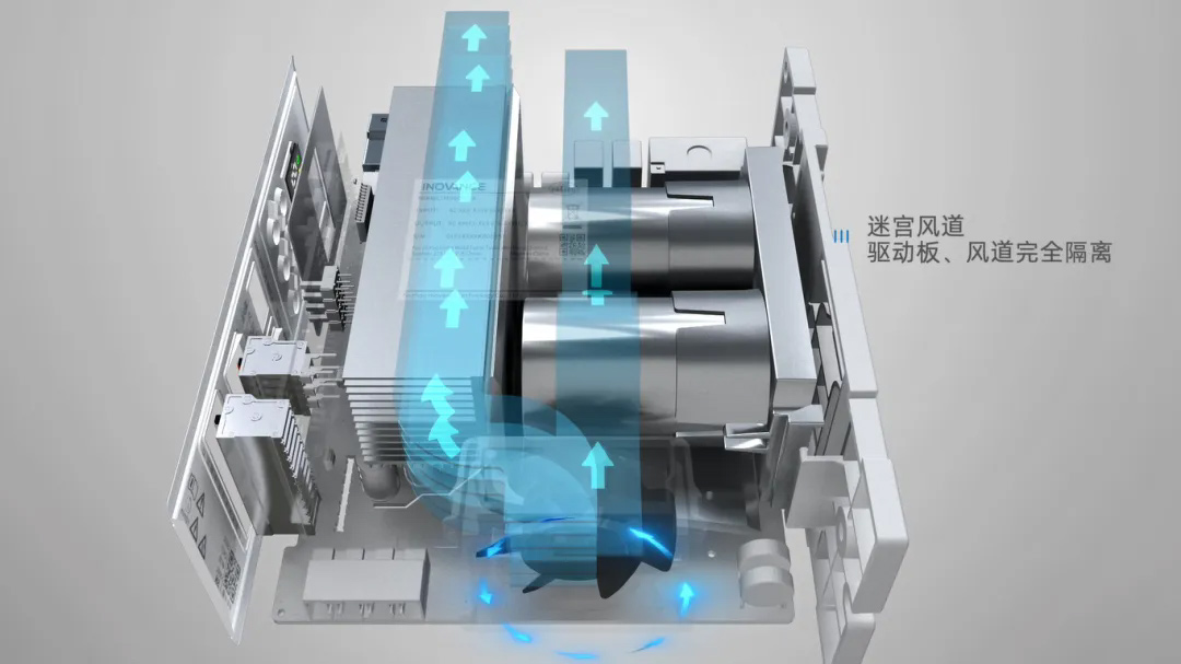 MD600采用迷宮風道設(shè)計,風道與驅(qū)動板完全獨立,加上100%三防漆,有效防止雜質(zhì)、粉塵等進入驅(qū)動板內(nèi)部,保障在惡劣環(huán)境中的可靠運行。MD600還可自定義正反轉(zhuǎn),有效防止棉絮等異物堵塞風道。同時采用無驅(qū)風扇,風扇驅(qū)動集成在驅(qū)動板內(nèi)部,增加易損件的可靠程度。