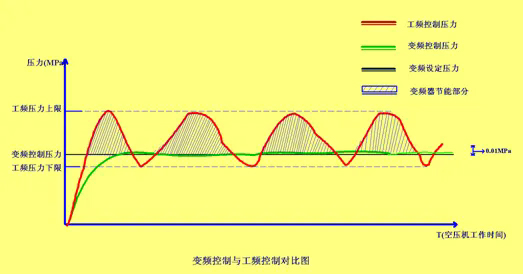 例如:假設(shè)實(shí)際用氣壓力為7Bar,工頻機(jī)組設(shè)定“工作壓力上限”和“工作壓力下限”分別為6bar和8bar。壓力就在8bar和6bar之間浮動(dòng),而電磁閥在8bar時(shí)卸載,6bar時(shí)加載,2bar壓差就帶來(lái)了高負(fù)荷電流損耗。圖中陰影部分即為節(jié)省的能耗。