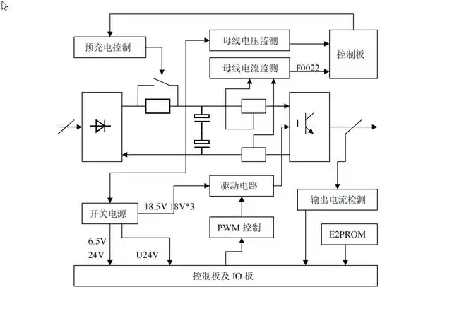黃線:主回路信號(hào)流向;寬紅線:變頻器輸入輸出電流;寬綠線:來(lái)自控制板的信號(hào); 窄紅線:電源信號(hào); 窄綠線:控制信號(hào)。