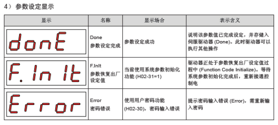 1. 許多參數(shù)運行中不能設(shè)置,但是DI5使能端子可能上電就導通,這時候面板顯示run狀態(tài),像參數(shù)方向H02-02、脈沖選擇H05-01、H02-31恢復出廠設(shè)置、H0D-11點動、H0D-02慣量辨識都不能設(shè)置,必須是rdy狀態(tài),這時候需要去掉使能。