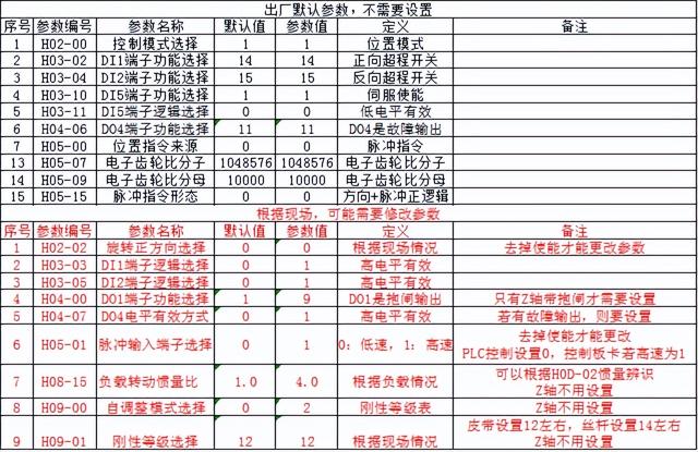 許多參數(shù)都是默認值,不需要設(shè)置,部分參數(shù)要根據(jù)電機是否抱閘,是PLC還是板卡控制來根據(jù)實際應用設(shè)置。