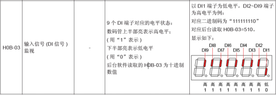 3、H0B-05,可以監(jiān)控DO狀態(tài),比如DO1用了抱閘輸出這個功能,若使能的情況下,抱閘應該松開,若仍然抱住,就可以通過看H0B-05的高低電平來判斷DO輸出是否正常,使能情況下,理論上D01應該是低電平;