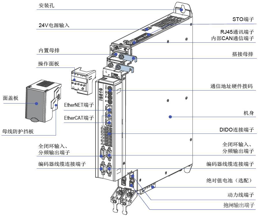 操作和接線主要集中在前側(cè)塑殼面板上,兩側(cè)為光潔平整的金屬蓋板,一看到這樣的框架布局,就知道 IS810N-INT 是支持多個(gè)模塊零間距并列組裝的,能夠幫助用戶節(jié)省多軸伺服驅(qū)動(dòng)單元在電氣柜內(nèi)的安裝空間。