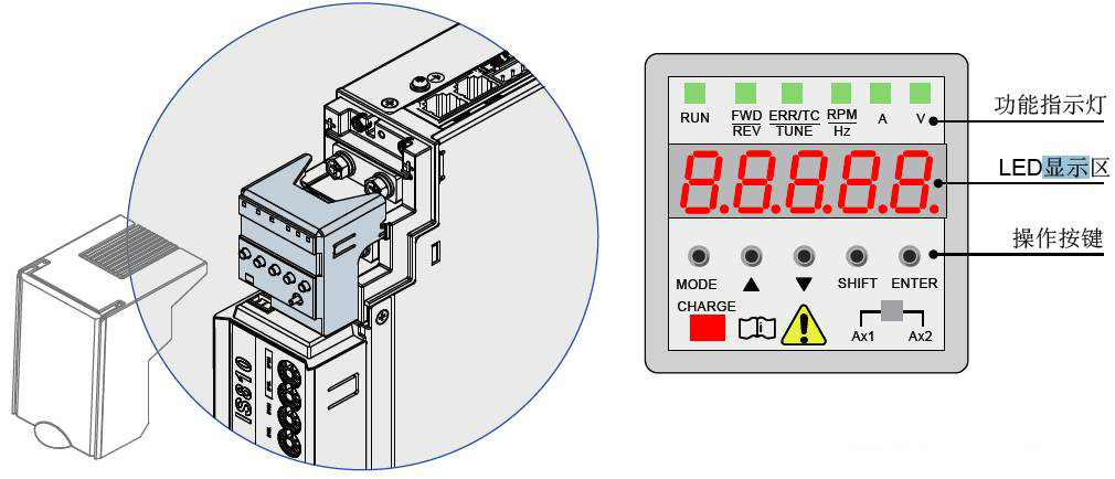 來(lái)到驅(qū)動(dòng)器面板最上方,其前端為 LED 操控顯示面板,尺寸約為 50 x 50 mm,有深色透明塑料蓋板作為保護(hù),其主要功能包括:5 位 8 段 LED 顯示、6 個(gè)功能狀態(tài)指示燈、5 個(gè)模式和參, 數(shù)調(diào)整操作按鈕、直流母線充電狀態(tài)指示燈...等,用以幫助用戶在現(xiàn)場(chǎng)對(duì)驅(qū)動(dòng)器的運(yùn)行狀態(tài)做到快速識(shí)別和及時(shí)調(diào)整。